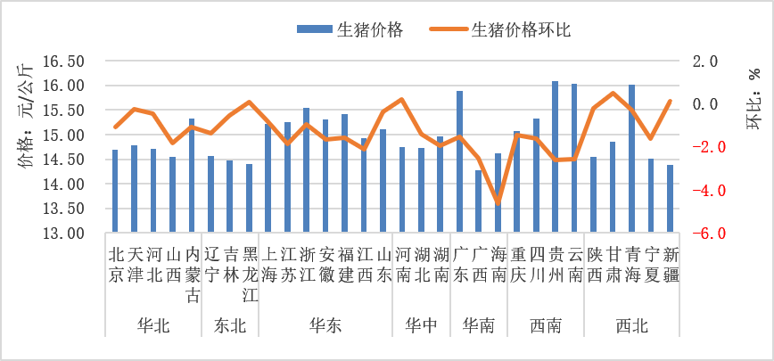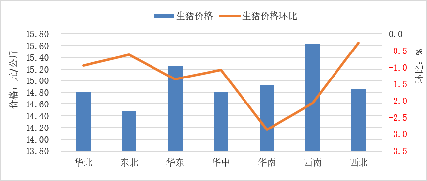 西南地域生猪平均价钱最高,贵州领跌,为14.48元/公斤。东北地域环比涨幅较大。