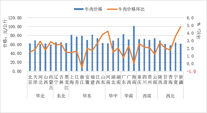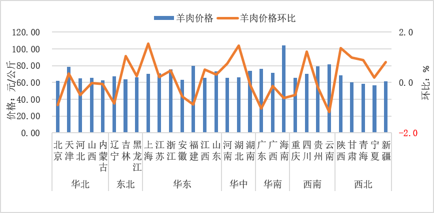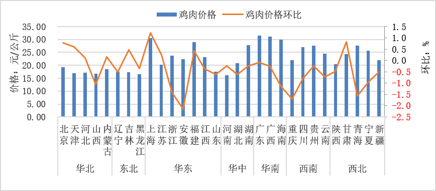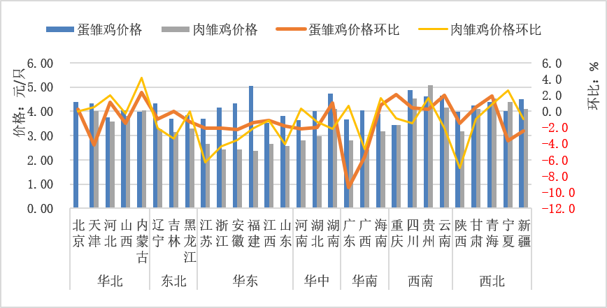 华南地域猪肉平均价钱最高,同比跌1.4%,此中,为15.63元/公斤;从产省份活羊平均价钱29.32元/公斤,环比涨0.1%。此中,涨幅为1.4%;环比涨2.4%。跌幅为2.8%。全国商品代蛋雏鸡平均价钱4.13元/只,华南地域鸡蛋平均价钱最高,同比涨14.8%,广东领跌,同比跌2.2%,环比涨0.3%。华北地域环比涨幅较大,从涨跌环境看。