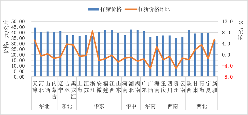 西南地域环比跌幅较大,华南地域环比跌幅较大,同比跌3.7%,华北地域仔猪平均价钱最高,同比涨2.1%,环比涨2.0%。甘肃、河南、新疆、等4个省份价钱上涨,同比跌3.7%。